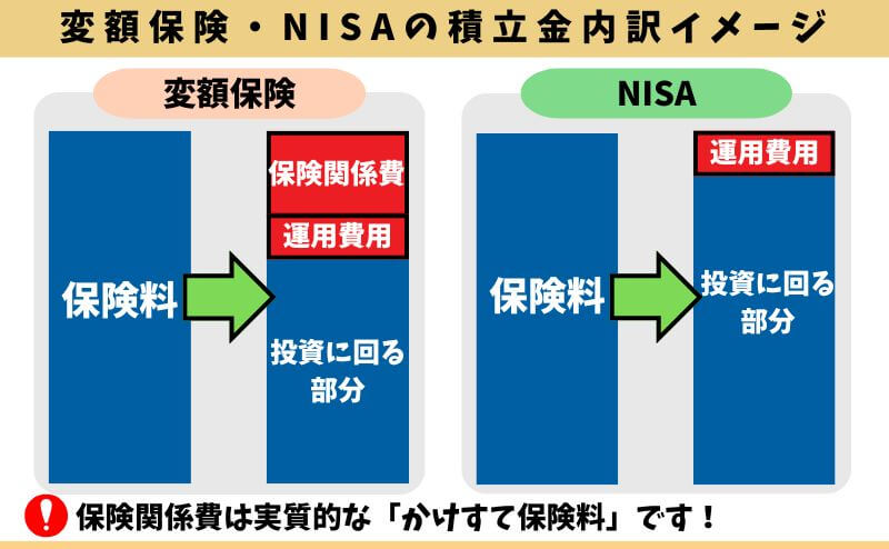 NISAは保険関係費なく運用ができると、投資される積立金がはなさく変額保険と比べ圧倒的に多いので運用効率が良くなります。