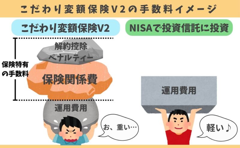 投資先によっては、こだわり変額保険V2のほうが運用費用を抑えられるものもありますが、保険関係費も追加でかかるので、総合的な手数料は保険以外で投資するより高くなってしまいます。